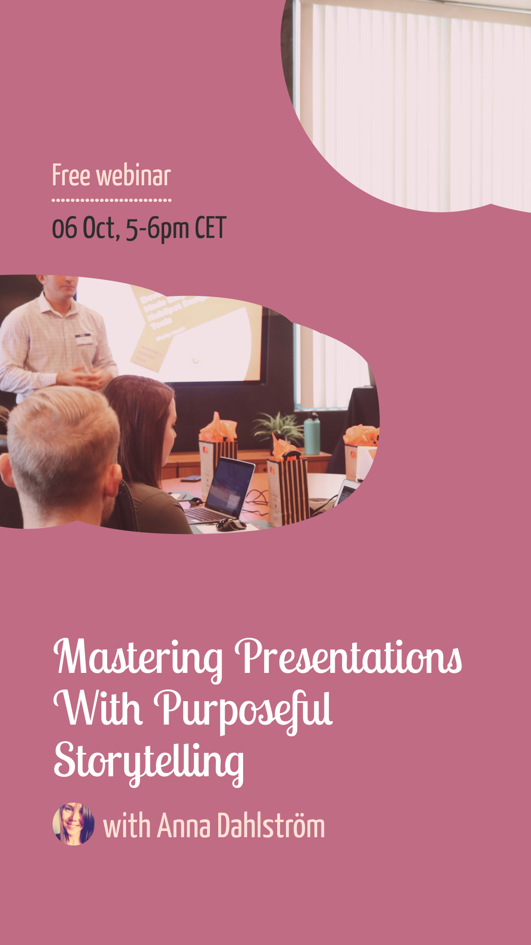In today’s fast-moving world, AI tools might help create your slides — but it’s still your delivery that makes the real difference. And that’s exactly what this webinar is about. Join Anna Dahlström, UX design leader and author of Storytelling in Design, for a live session that will introduce you to how applying purposeful storytelling can help get your message across, make you feel confident as a presenter, and achieve the outcome you're after. It's also an opportunity to ask questions about the topic, or our 'Effective Presentations Through Purposeful Storytelling' for which we're starting a 6-week guided walkthrough on the 03 November.